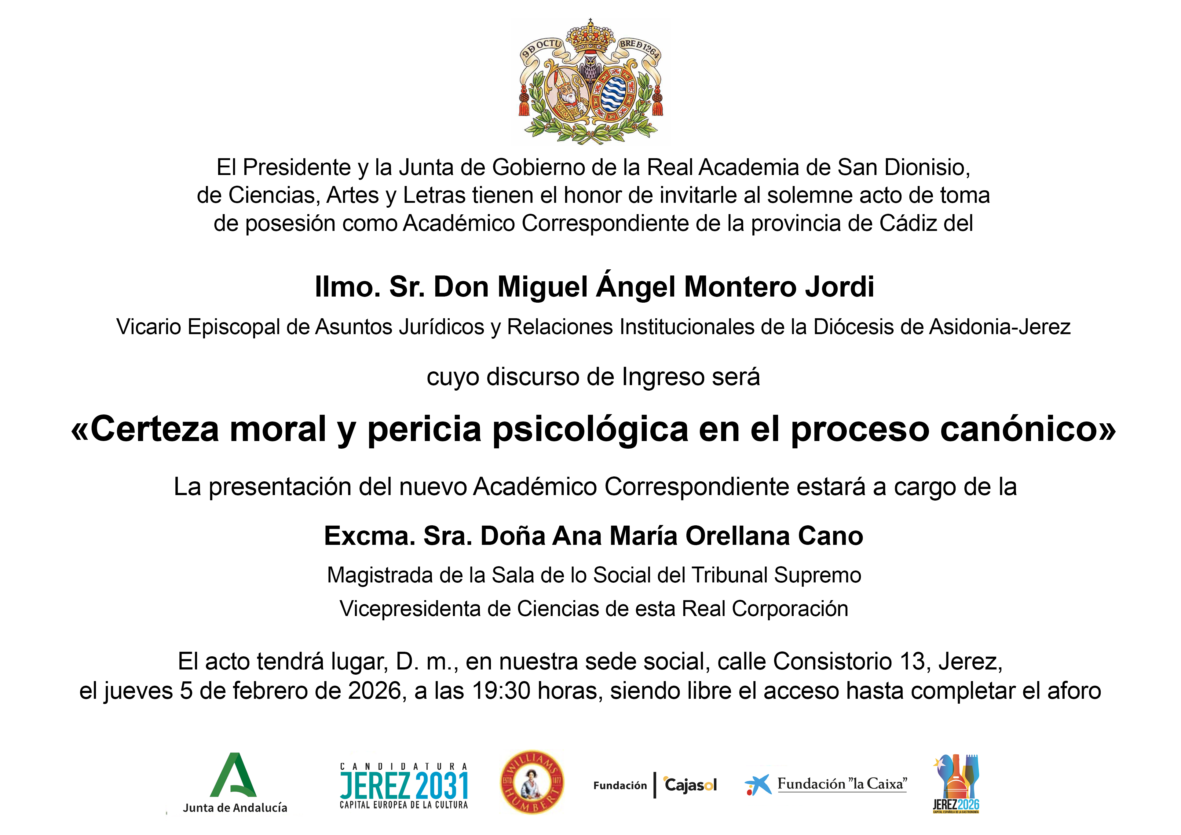 El Presidente y la Junta de Gobierno de la Real Academia de San Dionisio, de Ciencias, Artes y Letras tienen el honor de invitarle al solemne acto de toma de posesión como Académico Correspondiente de la provincia de Cádiz del lImo. Sr. Don Miguel Ángel Montero Jordi, Vicario Episcopal de Asuntos Jurídicos y Relaciones Institucionales de la Diócesis de Asidonia-Jerez, cuyo discurso de Ingreso será «Certeza moral y pericia psicológica en el proceso canónico».