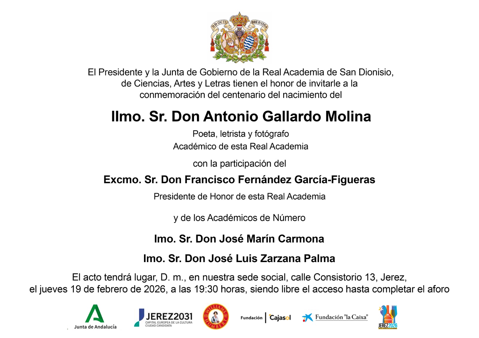 El Presidente y la Junta de Gobierno de la Real Academia de San Dionisio, de Ciencias, Artes y Letras tienen el honor de invitarle a la conmemoración del centenario del nacimiento del Ilmo. Sr. Don Antonio Gallardo Molina, Poeta, letrista y fotógrafo, con la participación de Excmo. Sr. Don Francisco Fernández García-Figueras, Presidente de Honor de esta Real Academia; Imo. Sr. Don José Marín Carmona e Imo. Sr. Don José Luis Zarzana Palma.